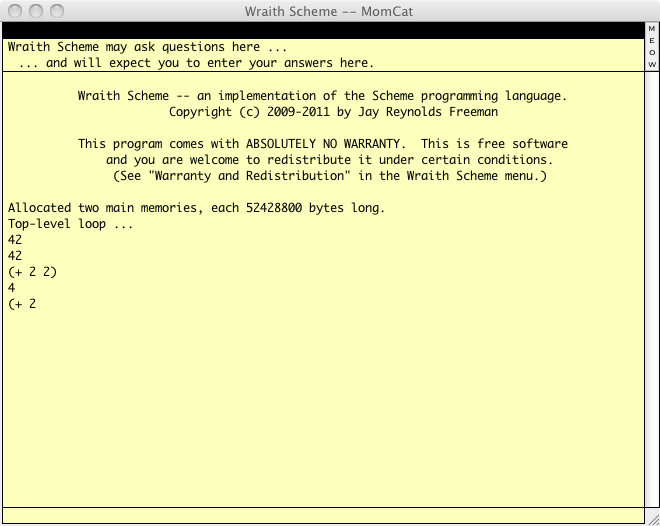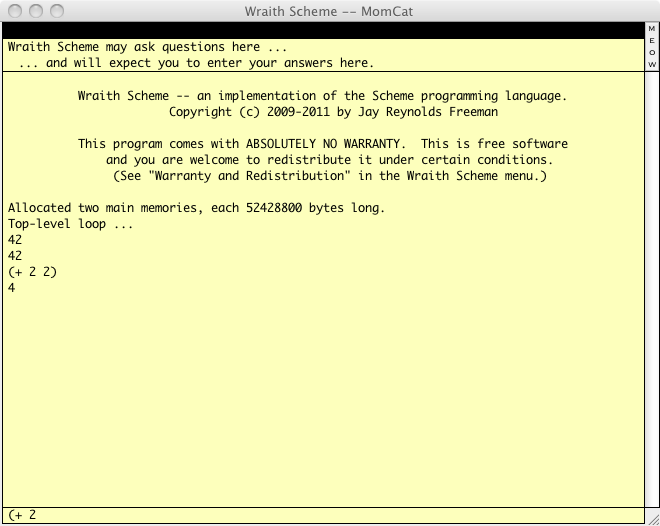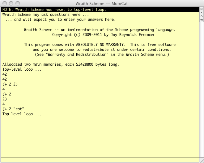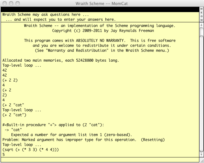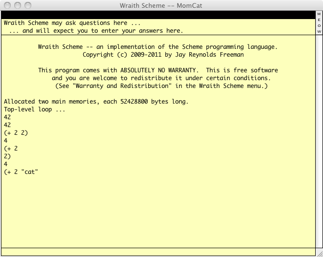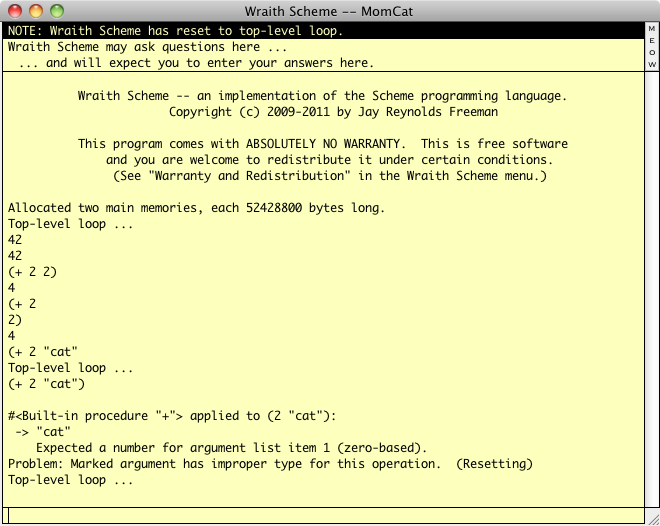 If you are wondering what would have happened if you had gone ahead and typed the final parenthesis, here is what happens when you tell Wraith Scheme to add two to a cat: