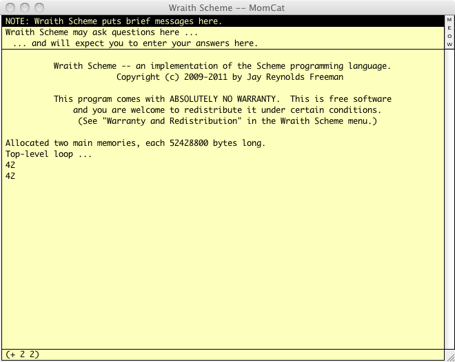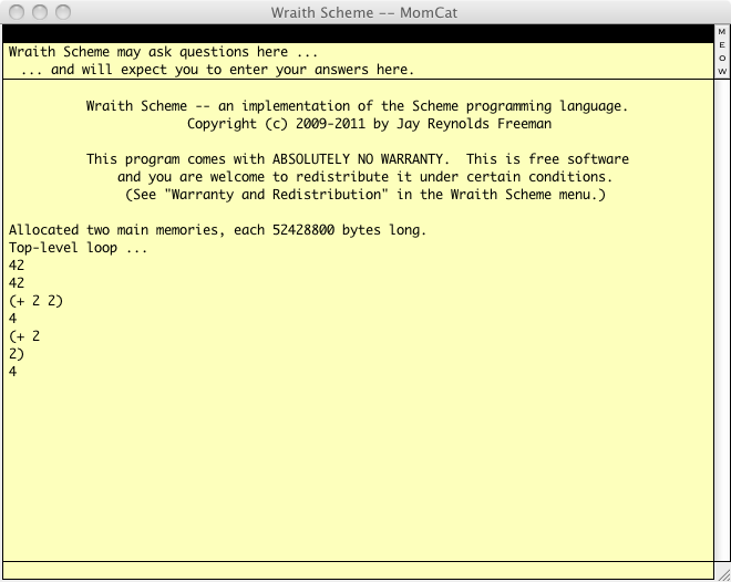 Specifically, you type in the short, wide yellow panel at the bottom of the main window -- the panel that is nearly the full width of the window but only one character high. I call that panel the Input Panel. When you have typed a line of text there, you get Wraith Scheme to process it by pressing the "return" key. Wraith Scheme will type back what you have given it in the much larger yellow panel that takes up most of the window, followed by whatever result it got from the processing. I call the larger panel the Main Display Panel.