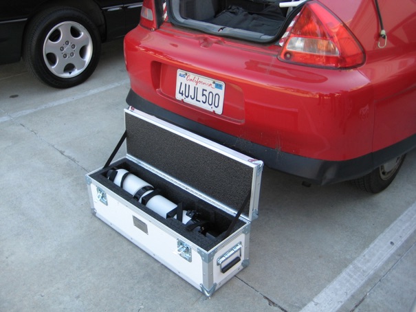 I bought ScopeGuard’s case to hold the telescope with tube rings and Losmandy dovetail plate attached. The case Astro-Physics ships has space for extra caps for the disassembled tube, which I do not need in the field, so this unit is smaller. Don Holcombe (ScopeGuard) does good work.