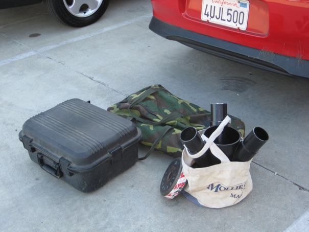 The Doskocil case holds the equatorial head. A small duffle contains the telescoped tripod legs, the counterweight shaft (inside its own little case made of ABS plastic pipe), and a ditty bag with fasteners, cables, the polar-alignment telescope, and a few Allen wrenches. A totebag carries the tripod head.