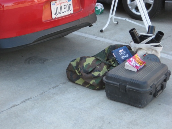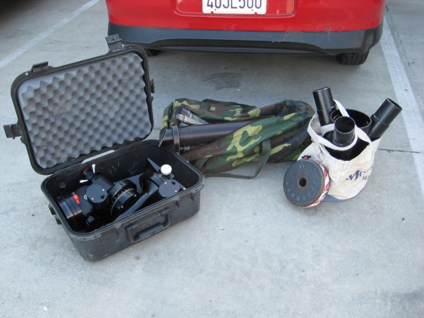 All loaded. I stow the counterweight between the passenger seat and the right side door. The orange case holds a small binocular. My eyepiece case, battery, and briefcase of atlases and books are in the passenger seat, but there is room for the entire observing kit on the deck of my Honda Insight.